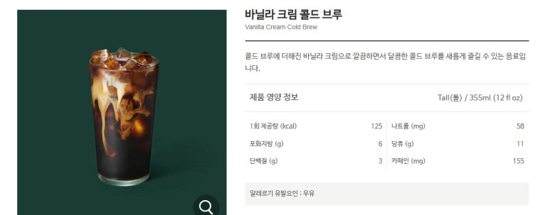 톨 사이즈(355ml) 기준 1회 제공량은 125Kcal, 포화지방 6g, 당류 11g, 카페인 155mg이 들어간 제품이에요!
